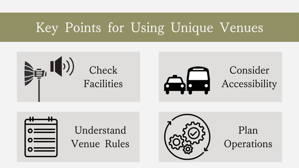 In conferences held at unique venues, thorough preparation is the key to success. First, it is essential to check the venue’s facilities, including audio-visual equipment and Wi-Fi, and arrange for additional rentals if necessary. Accessibility and parking availability are also critical considerations to ensure participants can arrive without difficulty. It is equally important to understand the venue’s rules, permitted hours of use, and any restrictions in advance. Furthermore, if the program includes a reception or exhibition, careful planning of traffic flow and safety measures is required. By addressing these points beforehand, organizers can ensure smooth operations and deliver a memorable event that maximizes participant satisfaction.