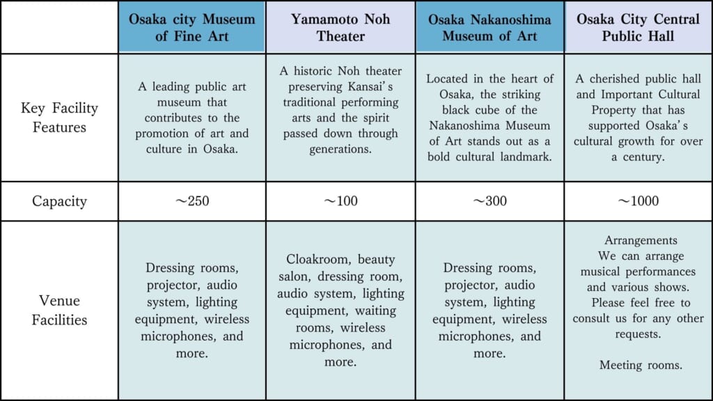 A reception party is a vital platform for communicating your brand message directly to guests. This is why choosing the right venue is a key factor in ensuring success. Osaka offers a diverse range of unique venues — from cultural heritage to innovative art spaces — allowing you to select the perfect environment that aligns with your event purpose. For formal occasions, Osaka City Museum of Fine Arts or Osaka City Central Public Hall are ideal. For cultural immersion, Yamamoto Noh Theater offers a truly distinctive experience. And for strong brand communication, Osaka Nakanoshima Museum of Art provides a modern and impactful setting. The story of the venue becomes part of the impression your company leaves behind. Make use of Osaka’s exceptional spaces to create a reception that resonates with every attendee.