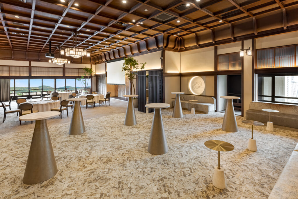 Situated within Osaka Castle’s Nishinomaru Garden, the Osaka Guest House is a prestigious Japanese-style building that has hosted events such as the 1995 APEC Summit and the 2019 G20 Osaka Summit Dinner. Inspired by the White Study Hall of Nijo Castle in Kyoto, the venue offers spectacular views of Osaka Castle and seasonal gardens. It accommodates up to 150 guests and features gourmet dining incorporating traditional techniques, as well as multilingual support, making it ideal for international conferences and formal gatherings.