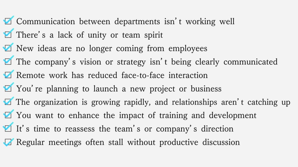 When should you consider implementing an off-site meeting? If any of the following situations apply, an off-site session may be highly effective in resolving team challenges and strengthening relationships: